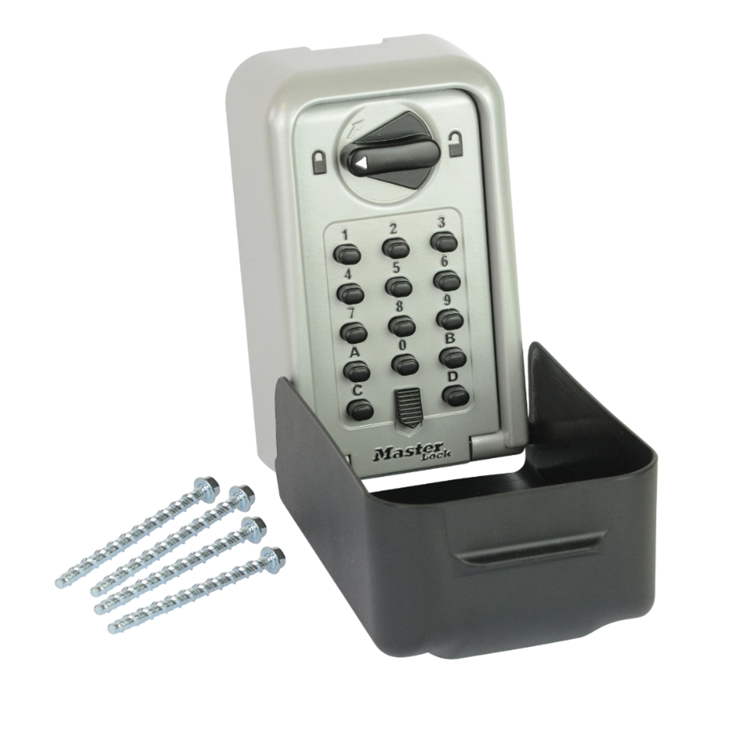 The 5426 EURD from Master Lock is a high security key safe with an extra large internal storage capacity which will accept multiple keys and access cards of all types. Its heavy duty zinc construction with recessed door makes it highly resistant to attacks and it comes with a removable black ABS plastic weather cover for added protection. It is Sold Secure Silver (Key safes) and Secured by Design (Police approved specification). It uses 14 large push buttons as part of its combination mechanism, with up to 16,000 potential combinations incorporating both letters and numbers.
