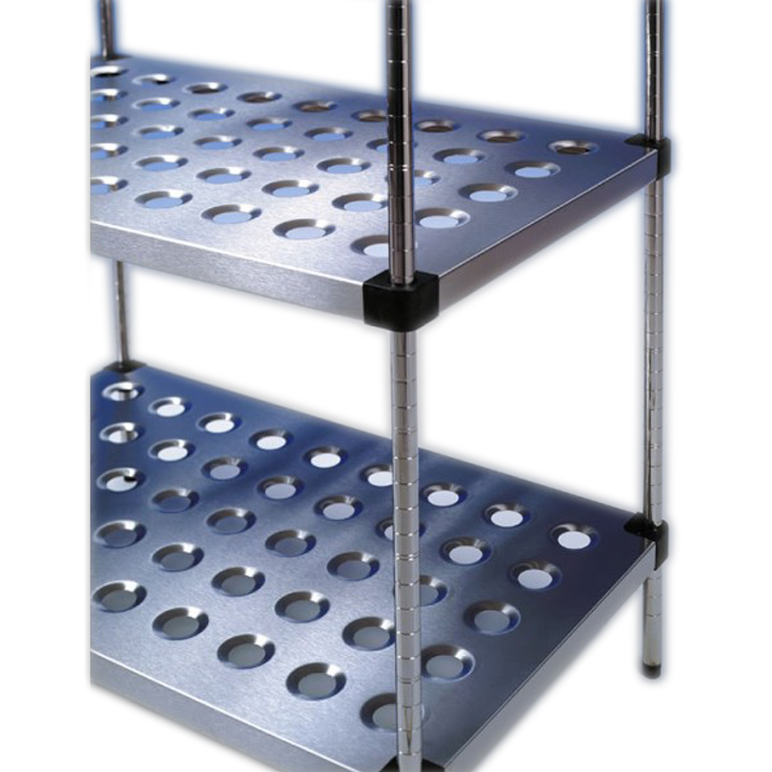 Manufactured from 304 grade stainless steel these 3 tier perforated stainless steel shelves complete with 32mm diameter dished perforations in the shelves themselves.